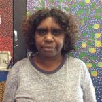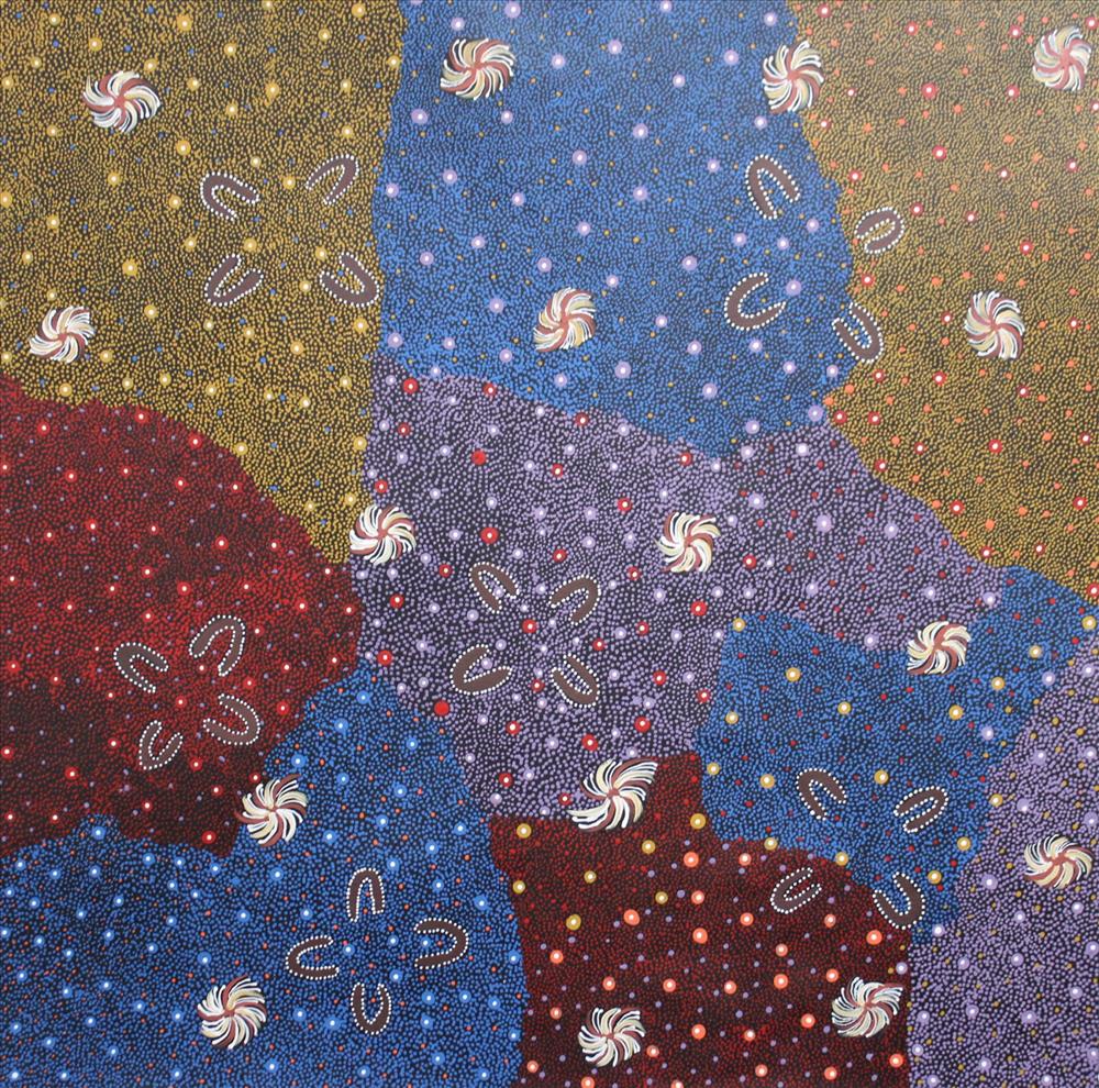 The men look for kangaroo, emu’s and bush turkey and the women and children go in search for bush fruits like bush banana and bush tomato. Women also dig for honey ants and witchetty grubs. The brown curved shapes in this painting represent women sitting out in the bush collecting the food. There is a lot of bush tucker out in country and Aboriginal people have been taught by their elder on how to find it. This is how our elders stayed healthy and survived out bush. It is important we keep our culture strong and pass this knowledge on to the younger generations.