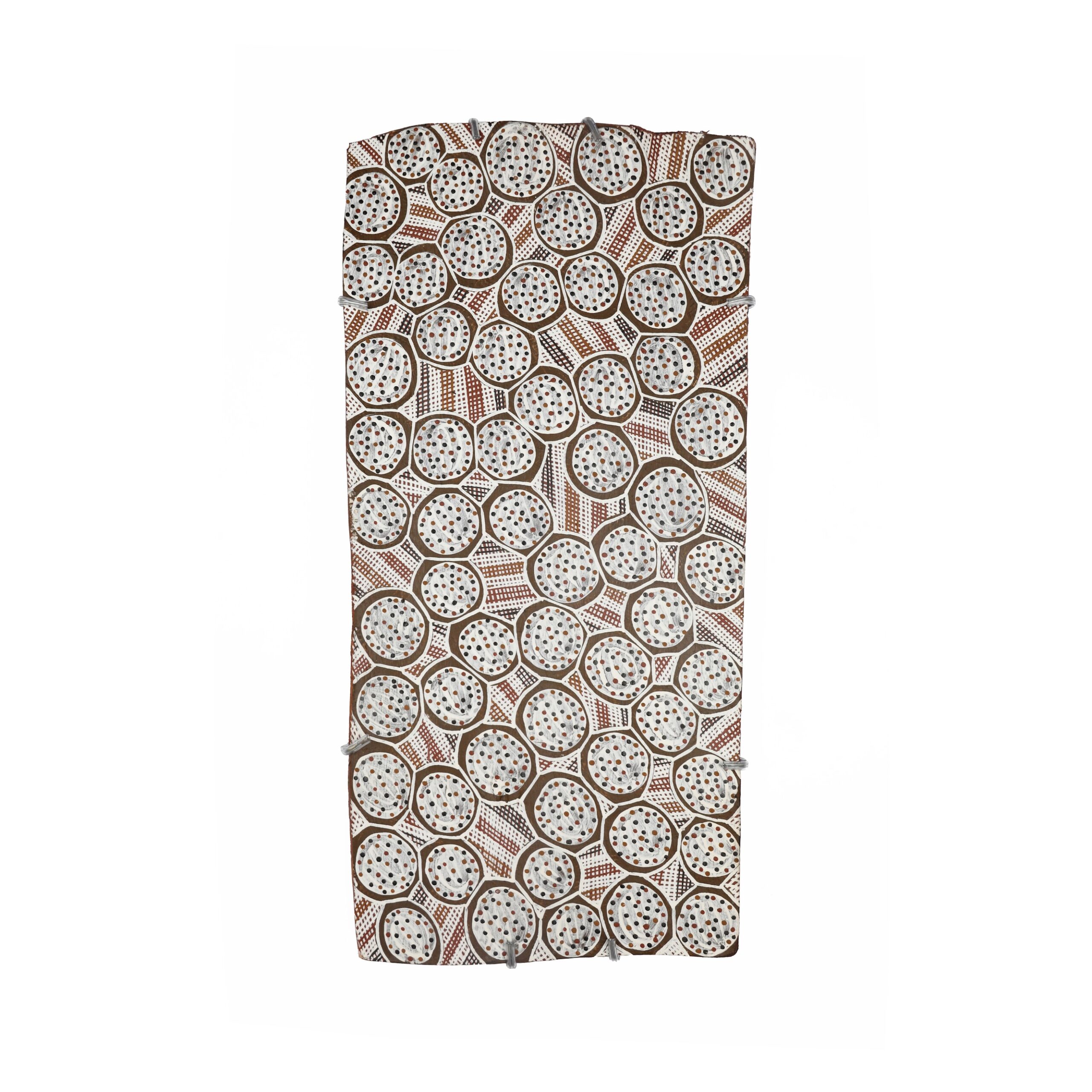 This imagery is of the Lily seed pods which Yolŋu collect and pound to remove the edible seeds from. It refers to perhaps the oldest continuous human religious iconographical practice: the story of the Rainbow Serpent. Estimates vary from 40,000-60,000 years on the depictions of the Rainbow Serpent in West Arnhem rock shelters.