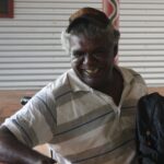 Ben Ward has depicted his adopted father’s Country of Dunham River. On the right hand side is Doon Doon – Dunham River, which today travels towards Lake Argyle Dam. The heart shape in the centre of the painting depicts Jimoordboord, a valley where the Thegooyeng or ancestral pigeon in the dreamtime lived. The blue line dissecting the shape is a small freshwater spring which runs towards Doon Doon.