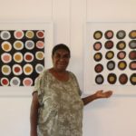 This is stone country – when I walk across this country there are lots of rocks and little stones. In the wet seasons the rivers are filled with coloured stones. This image also refers to a corroboree story given to the artist by her grandfather which describes the boundaries of the stony Miriwoong country as well as a representation of her mothers traditional country at Woorroo Woorrem east of Kununurra in the Kimberley region.