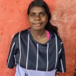 The bright pink colour in this piece is unusual in artwork from Milingimbi. The plant that the pink colour is derived from grows in the rocky country on the mainland at the end of the wet session. Milingimbi artists only have access to this plant when they travel west for funerals or other business, and there is great excitement in the studio when an artist returns with a supply of it. The beautiful green is made from boiling the ‘heart’ of the pandanus palm. The copper brown colour is extracted from the root of guḻtjiguḻtji. The yellows and oranges come from the root of the guninyi tree – harvested from nearby islands.