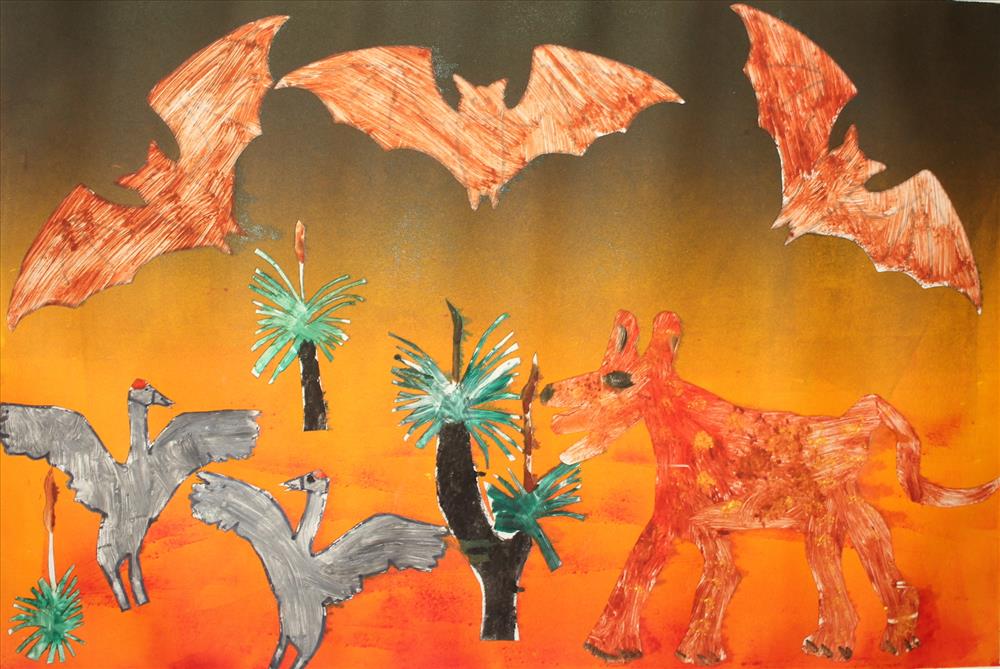 “My Totem Is Grass Tree” is a mono print made in 2023. A totem is how I connect to my country and ancestors. Totems are not just animals they can be at totem that comes from the land. I included a dog, brolgas and flying foxes. These animals all come from country just like me.