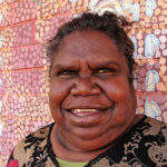 This ‘purrpalanji Jukurrpa’ (skinny bush banana Dreaming) comes from Pikilyi (Vaughan Springs), a large waterhole and natural spring to the west of Yuendumu, close to Mount Doreen. Napangardi/Napanangka women and Japangardi/Japanangka men are the ‘kirda’ (owners) of the skinny bush banana Dreaming at Pikilyi. Nangala women and Jangala men are the ‘kurdungurlu’ (custodians) of this Dreaming.